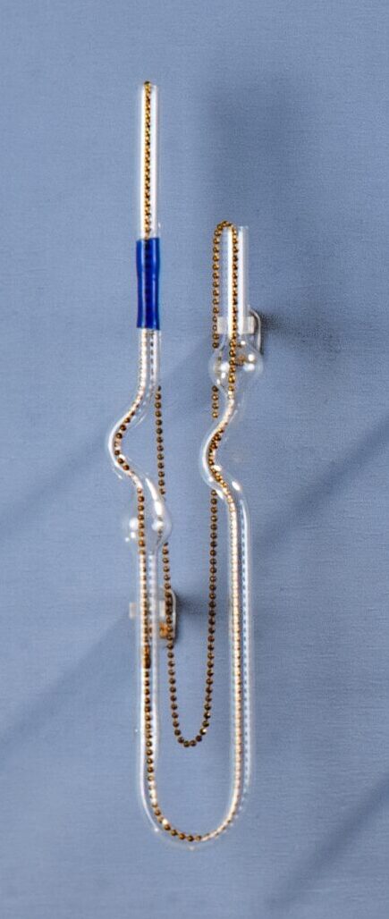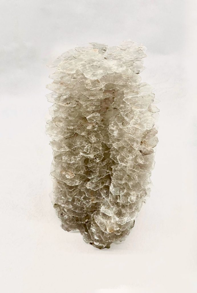 Láminas de mica con baño de resina y columnas acrílico cristal 5 mm. (Materiales: mica, tubos de acrílico cristal de 5 mm y resina cristal.)56x25x28 cm