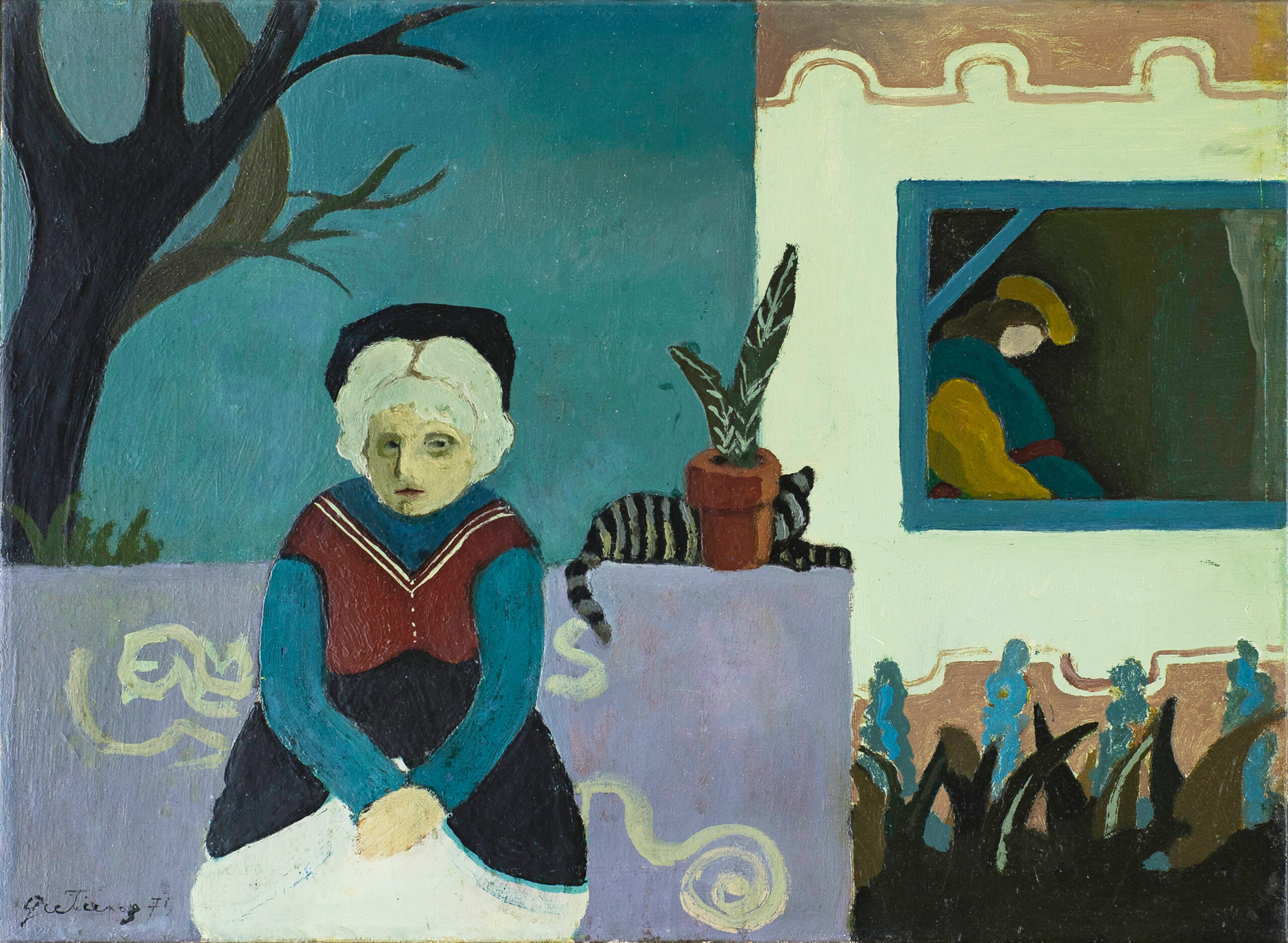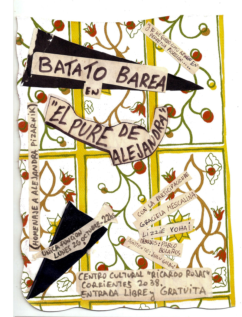 Aficheta Batato Barea en "El Puré de Alejandra", Centro Cultural Ricardo Rojas, Octubre 1986., 1986Collage y marcador sobre tela plástica.16.2 x 22.3 cm.Archivo Batato Barea