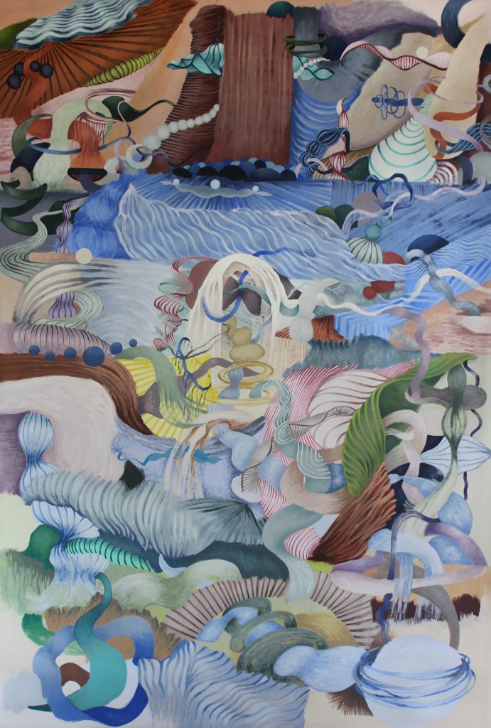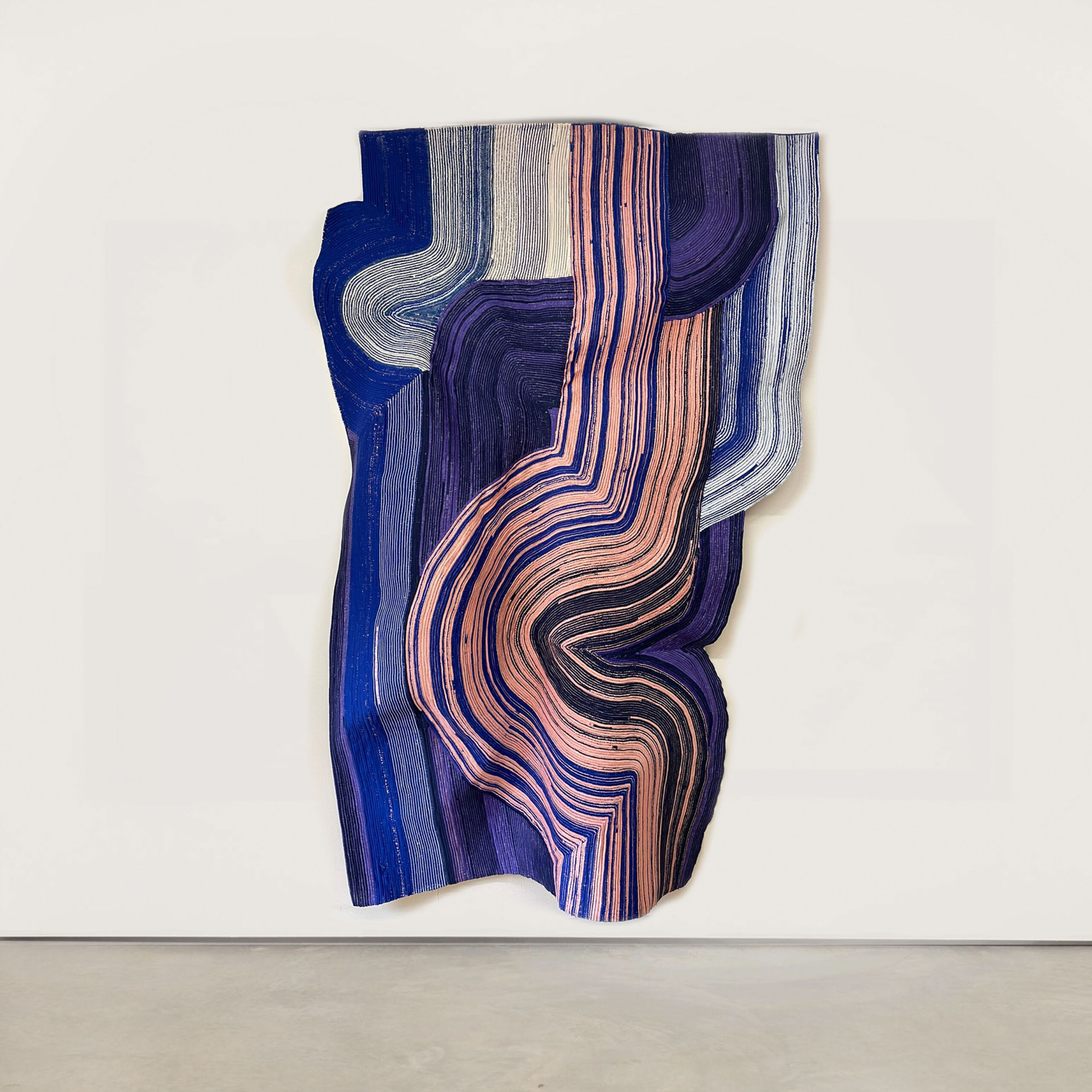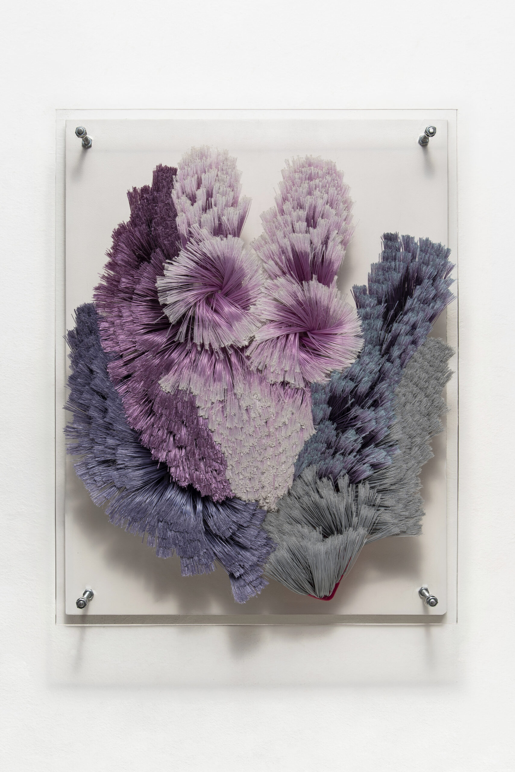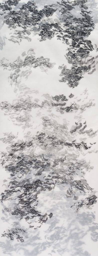 Bordado de cuentas de papel Tiziano sobre papel martillado Schoellershammer con hilo mercerizado de algodón en estuche acrílico, 49 x 132 cm